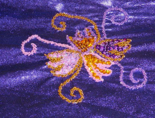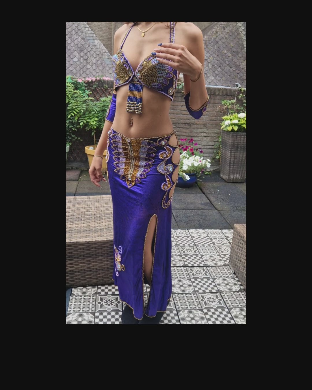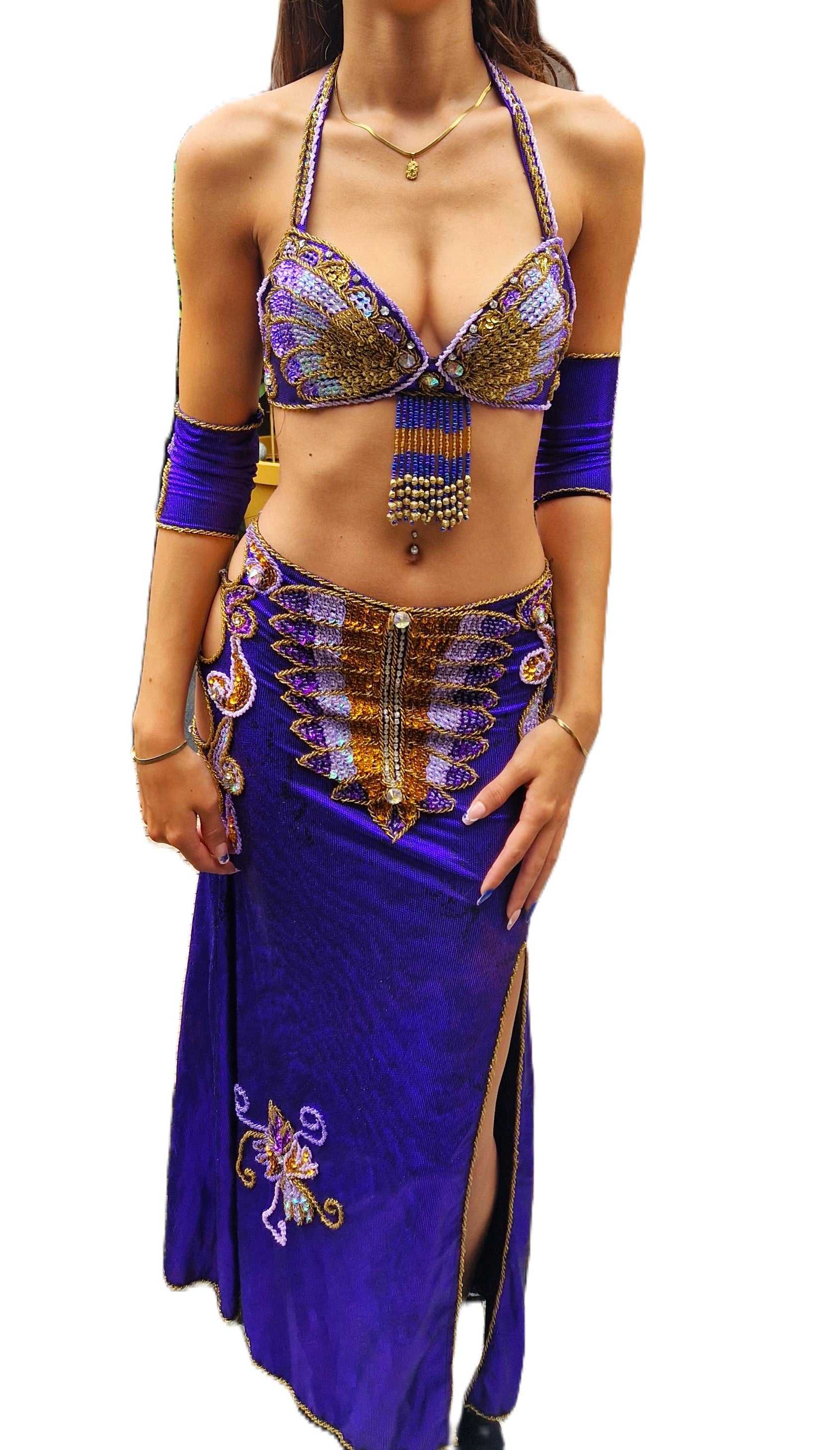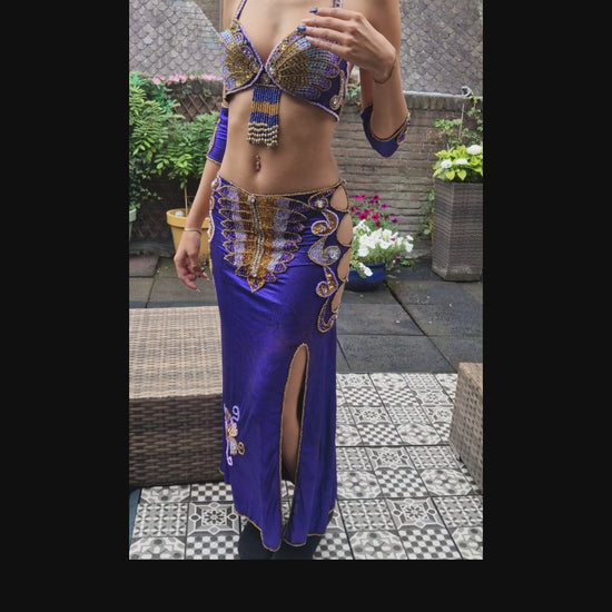 Prachtig bewerkt buikdanskostuum in paars.