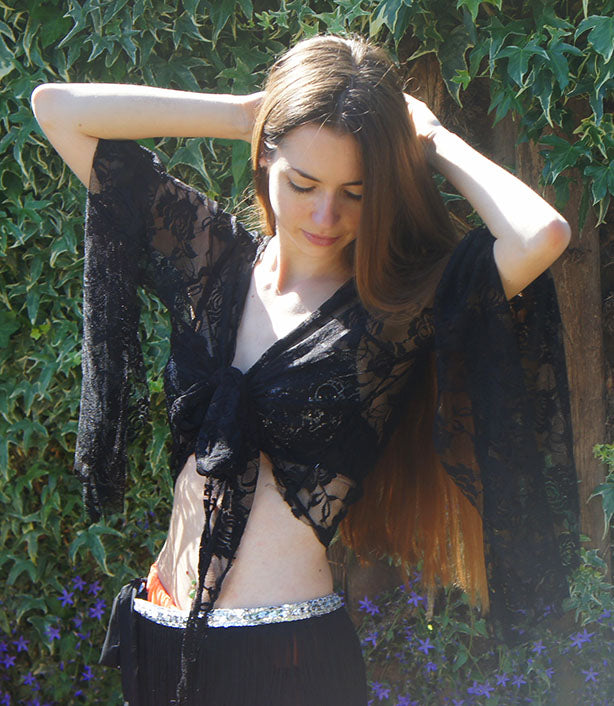 Zwarte kanten buikdanstop uit stretch stof met vlindermouw
