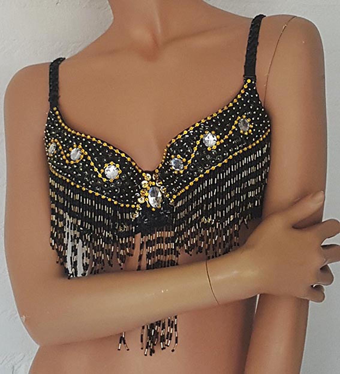 BH in zwart met gouden pailletjes en zilveren strasstenen.