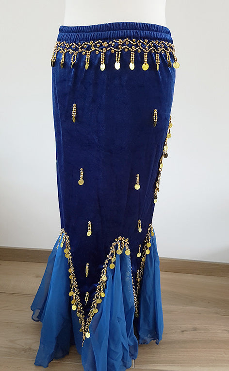 Blauwe buikdansrok van fluweel, met gouden accenten