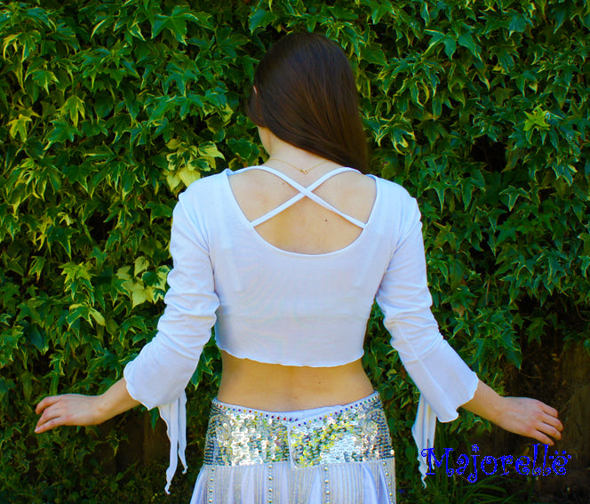 Leuke witte bindtop uit elastisch Jersey met vlindermouwtje.