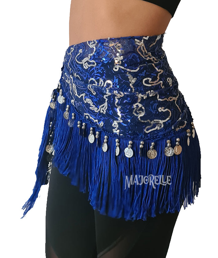 Buikdans heupsjaal blauw met zilveren lijntjes en zilveren muntjes