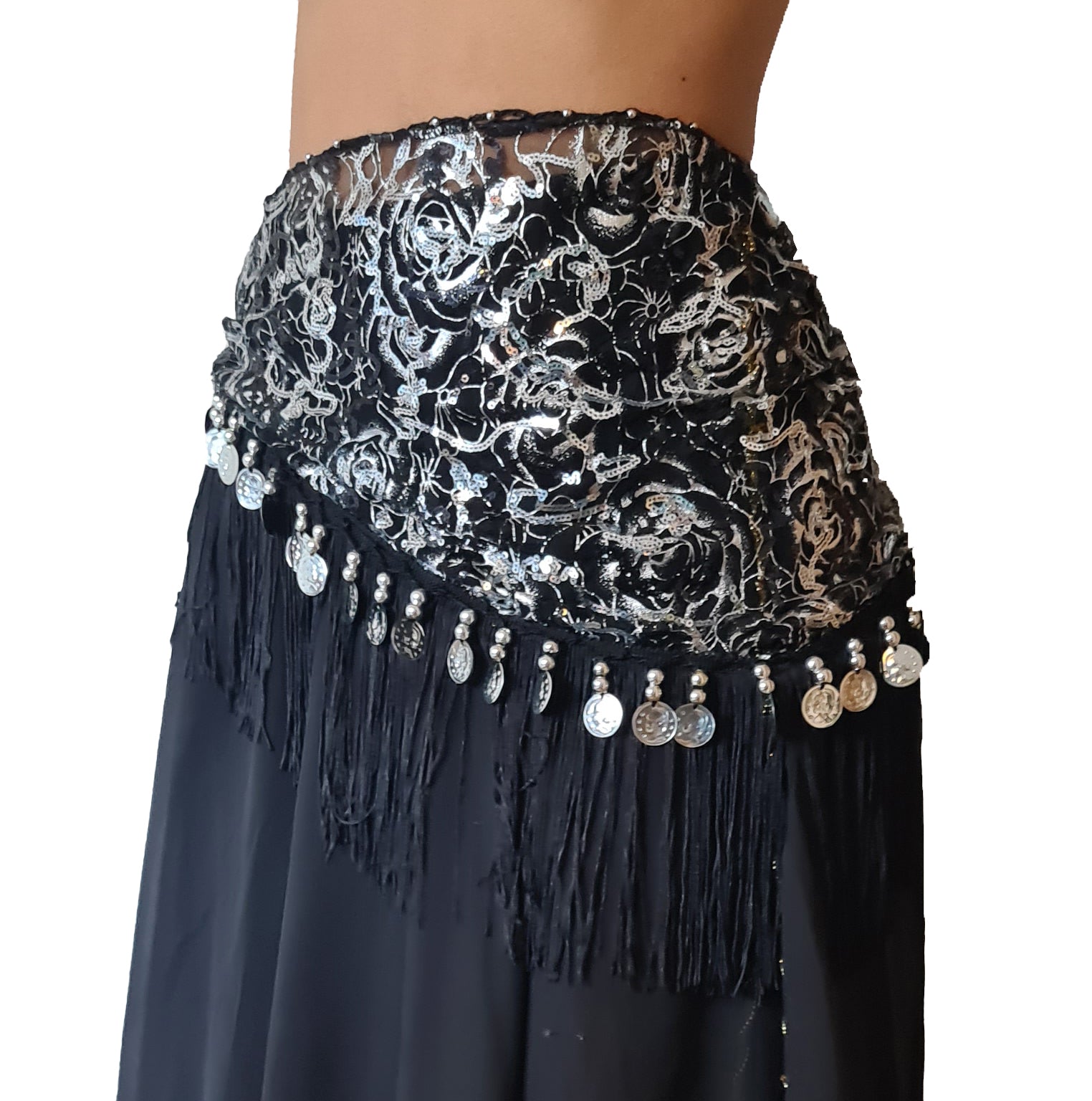 Heupsjaal zwart met zilveren lijntjes en zilveren muntjes