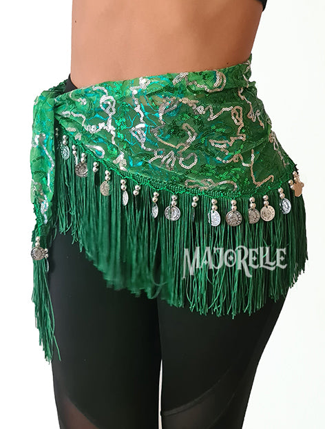 Buikdans heupsjaal groen met zilveren lijntjes en zilveren muntjes