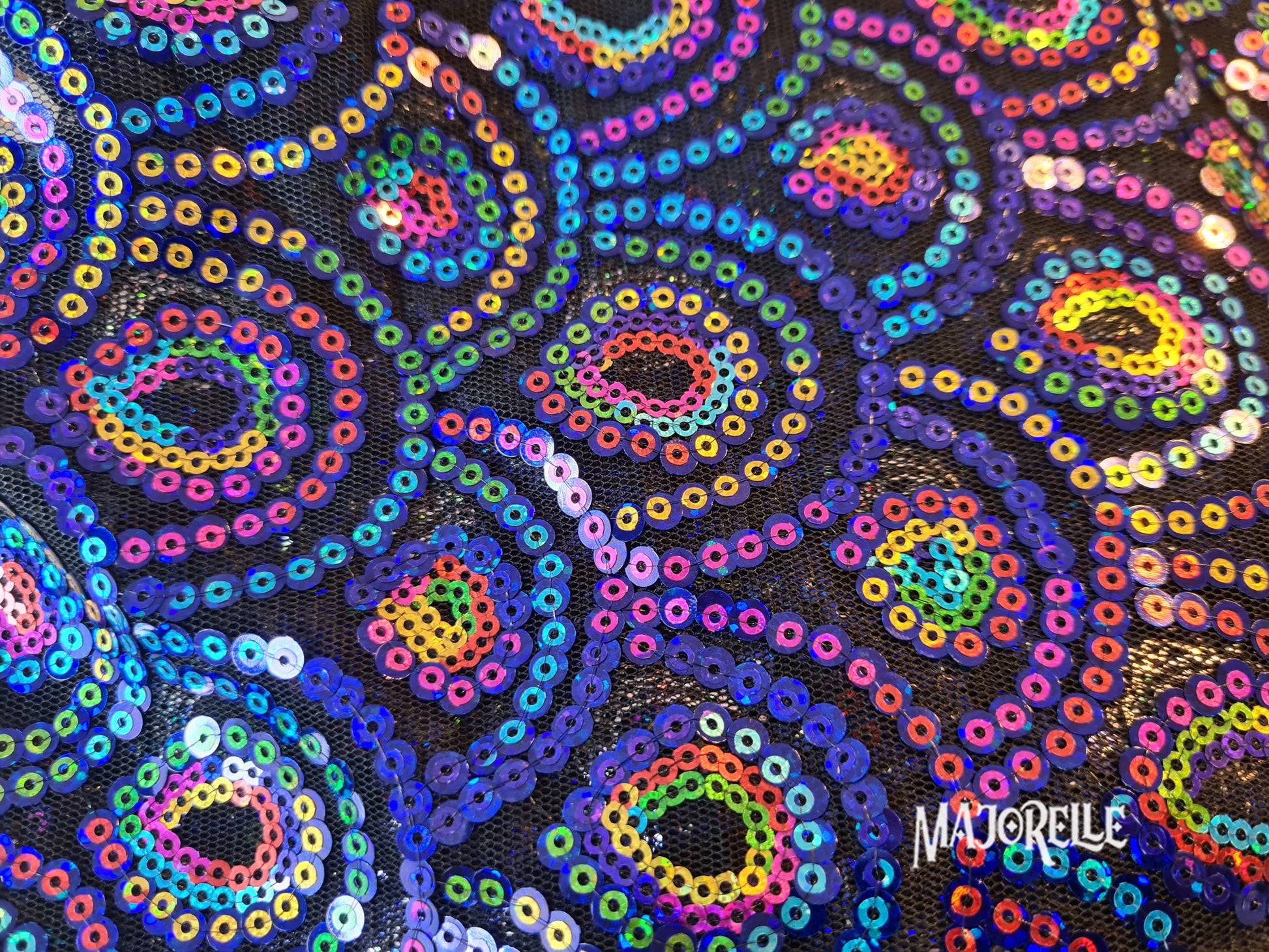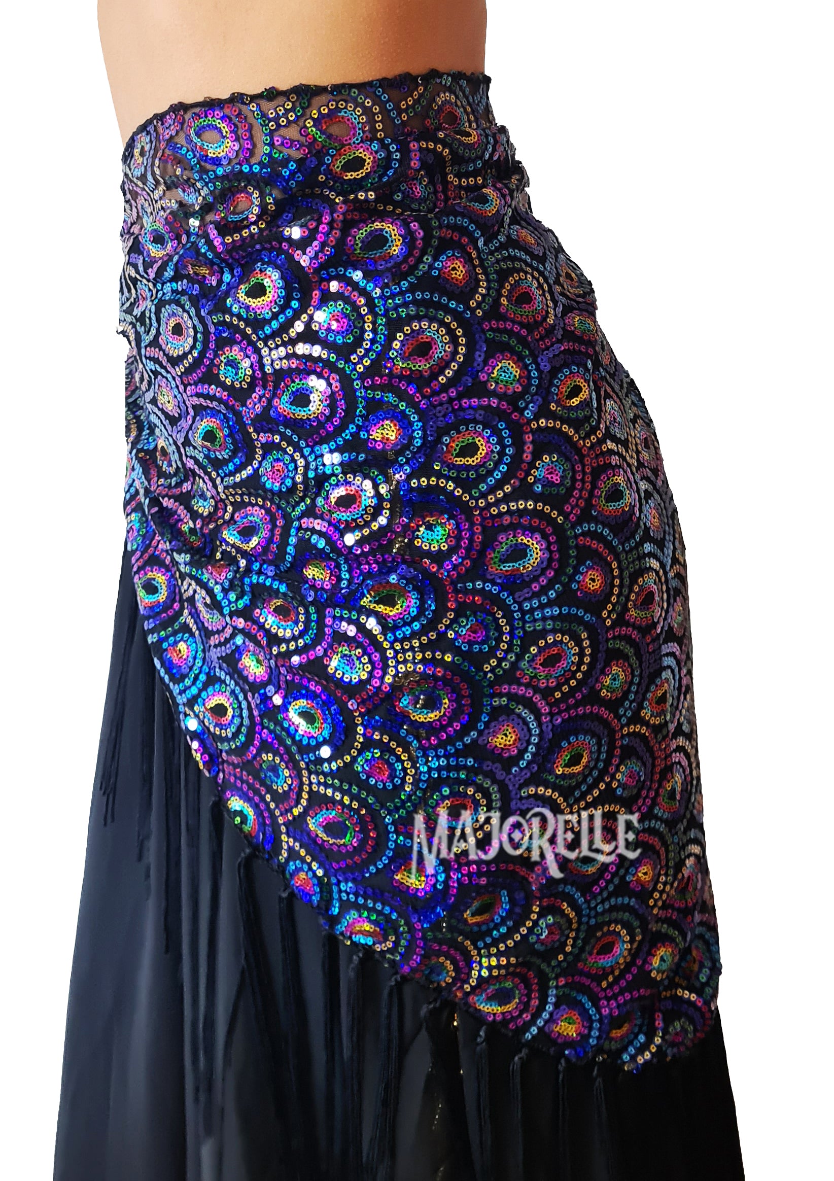Deze prachtige heupsjaal 'pauw' in zwart is een echte eyecatcher voor bij het buikdansen. De heupsjaal is versierd met schitterende kleine pailletjes in een pauwen design, met blauwe pailletjes en regenboog kleuren. Het glanst prachtig en geeft elke beweging een extra dimensie. Een must-have accessoire voor elke buikdanseres die graag in stijl wil optreden.