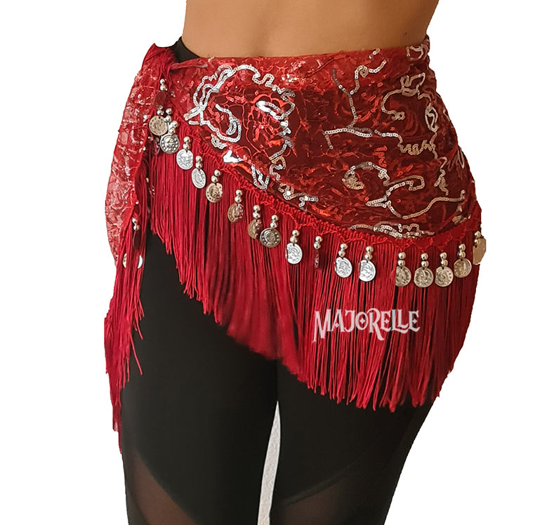 Heupsjaal rood met zilveren lijntjes en zilveren muntjes