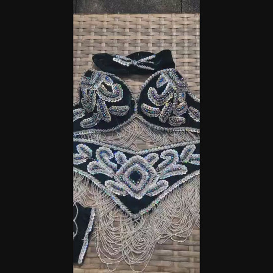 Buikdanskostuum donkergroen fluweel. BH, belt en sieraden
