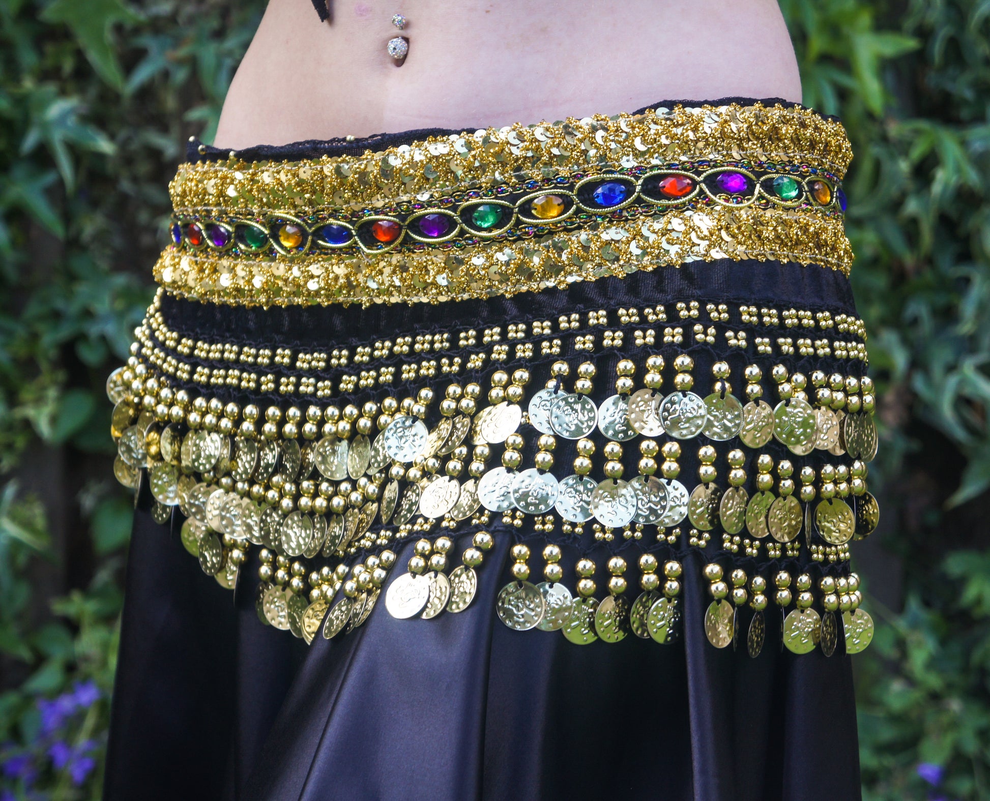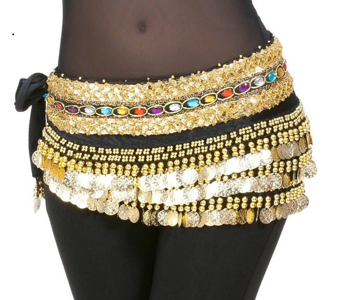 Mooie heupsjaal met 2 rijen gekleurde steentjes en 3 rijen gouden munten.