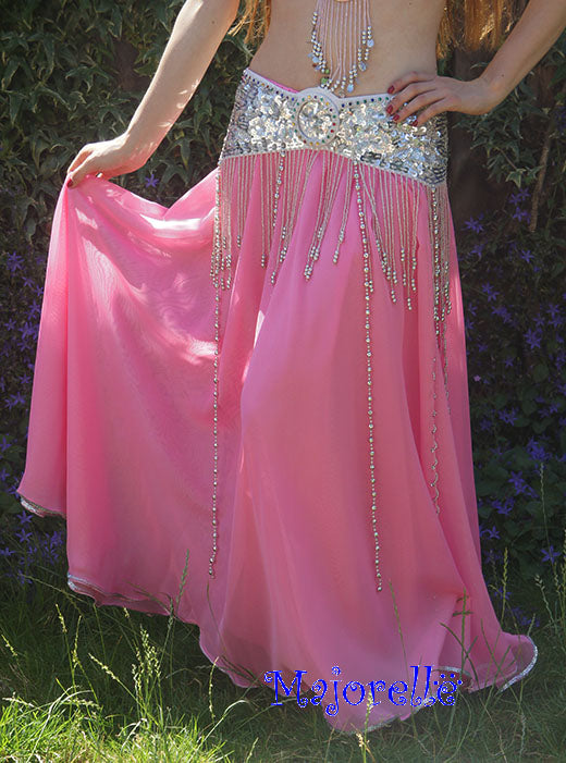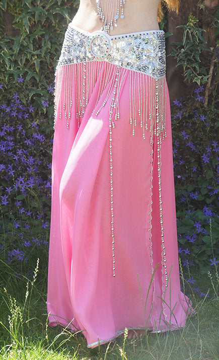 Buikdans rok lichtroze met split, afgewerkt met zilveren kraaltjes.