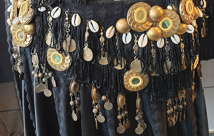 De belt is versierd met echte Kauri schelpen en spiegeltjes, wat zorgt voor een magische en betoverende uitstraling. Voeg deze unieke en sierlijke set toe aan je buikdanscollectie en laat je innerlijke godin stralen tijdens je optredens en danssessies.