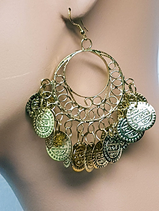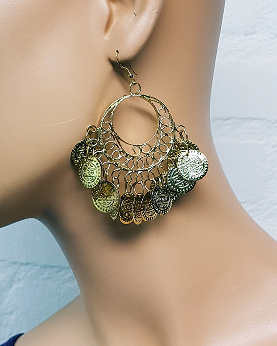 Goudkleurige ronde oorbellen met muntjes. deze oorbellen zijn niet zwaar.