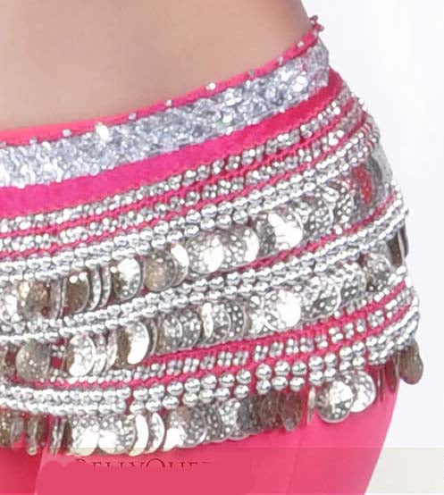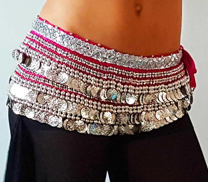 Mooie sjaal met 3 rijen zilverkleurige munten en een zilverkleurige band Bewerkt deel 75 cm lang, totale lengte sjaal incl. knoopgedeelte 125 cm