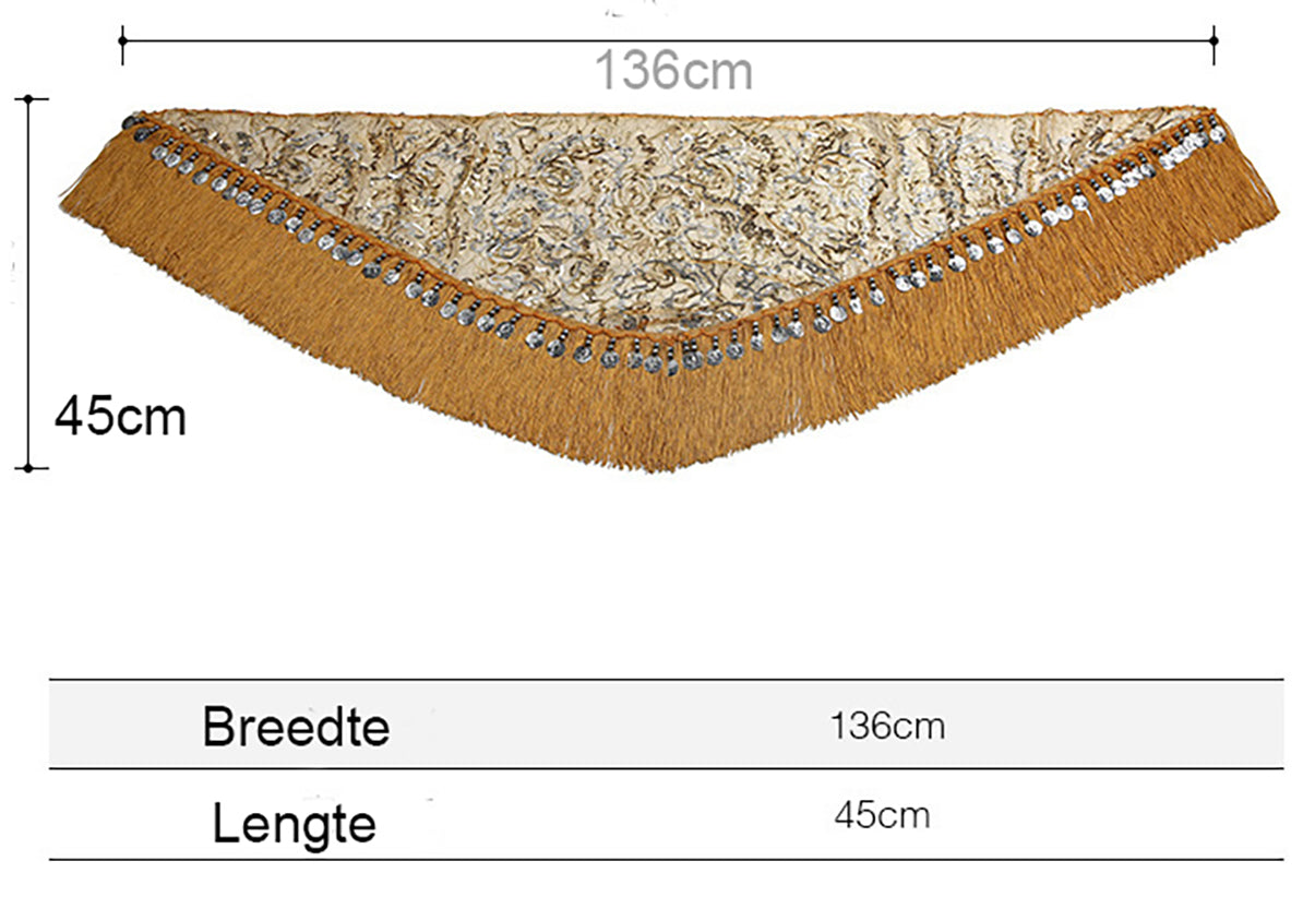 De sjaal heeft een hoogte van 45 cm en een lengte van 136 cm inclusief de muntjes. De muntgordel kan gedragen worden van S tot XL, waardoor hij geschikt is voor verschillende lichaamstypes. Met deze heupsjaal steel je zeker de show tijdens je optredens of danslessen.