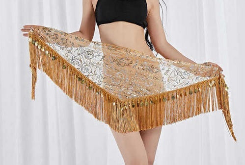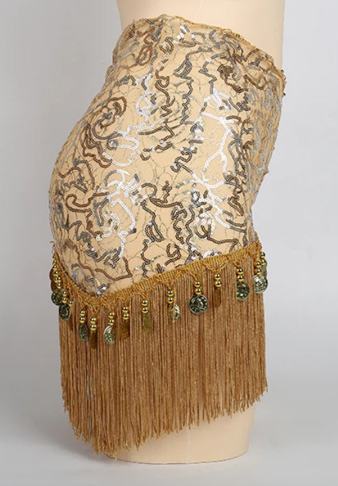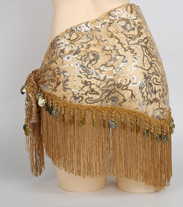 Deze prachtige goudkleurige buikdans heupsjaal met lijntjes van kleine pailletjes en gouden munten is een perfecte toevoeging aan je buikdansoutfit.