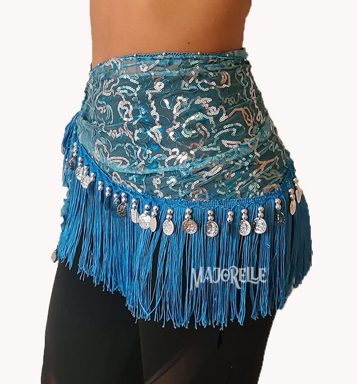 Heupsjaal turquoise met zilveren lijntjes en zilveren muntjes