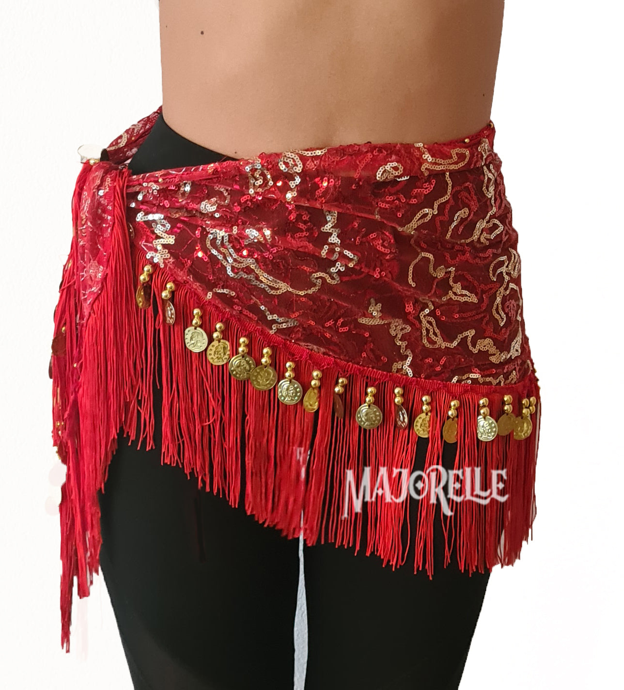 Heupsjaal rood met gouden lijntjes en gouden muntjes