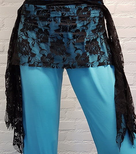 Heupsjaal van kant, in zelfde stof als broek en top met kant.