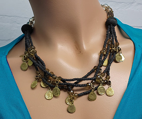 Ketting met houten zwarte kralen en oude lichtgouden muntjes