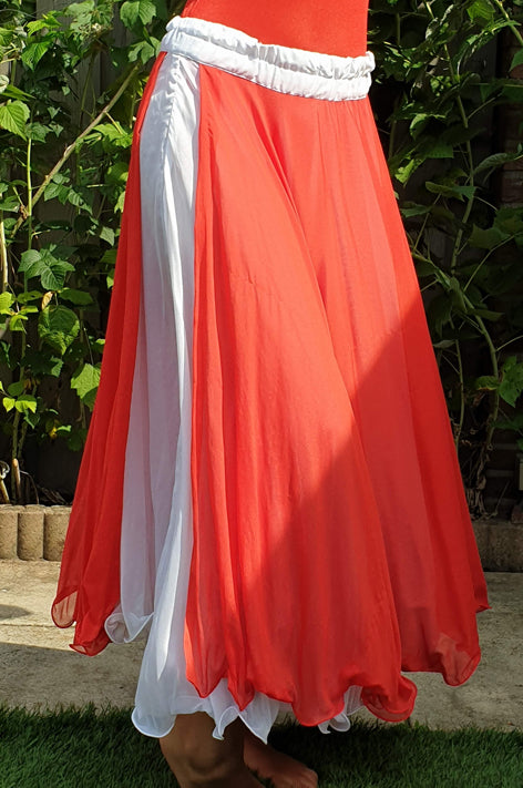 Rok in 2 lagen, bovenste rode laag lag valt over de onderste. witte laag.