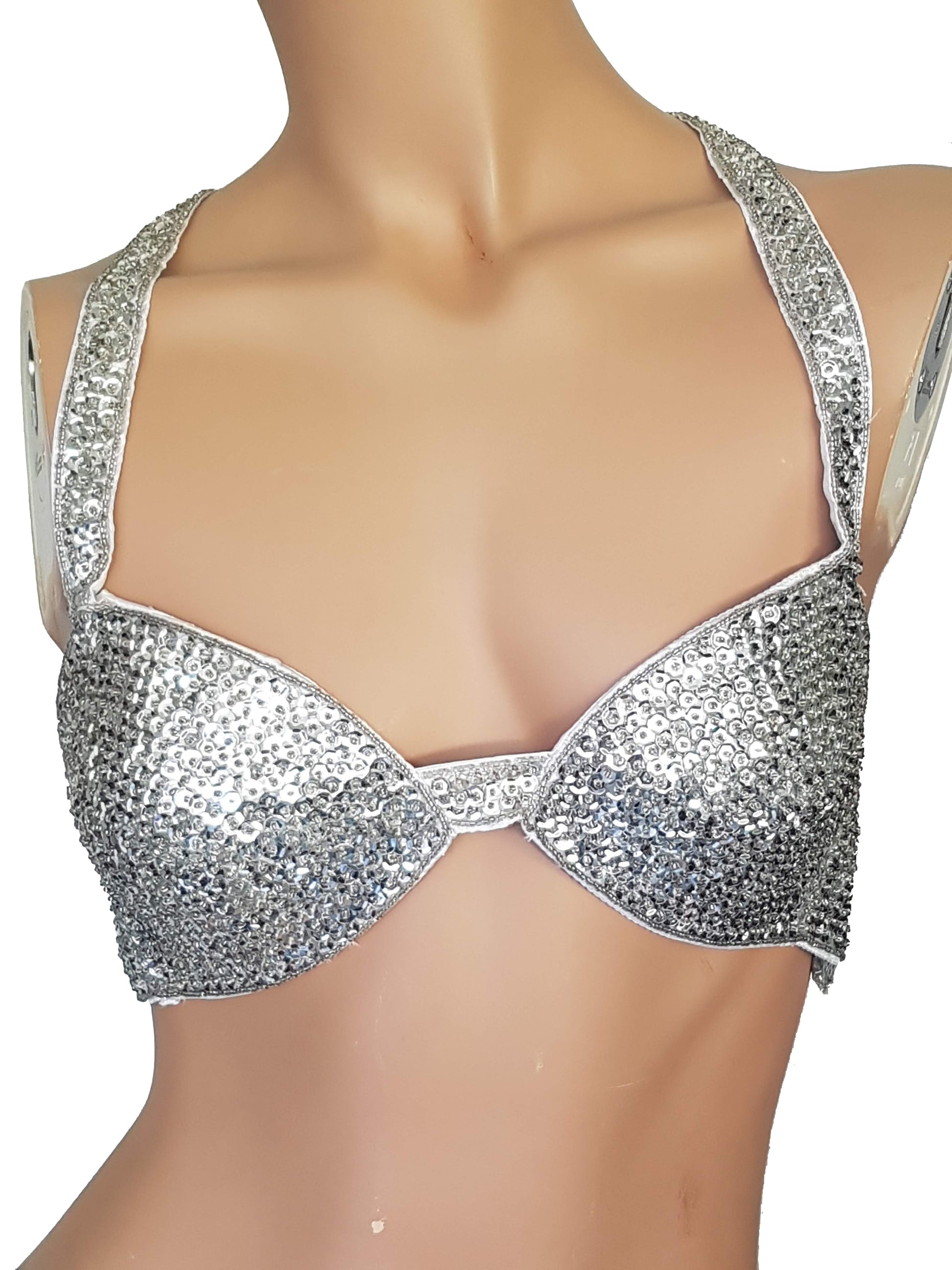 Buikdans BH in compleet zilver handbestikt met pailletjes