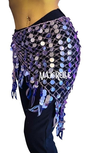 Prachtige gehaakte heupsjaal in lila, met grote pailletten