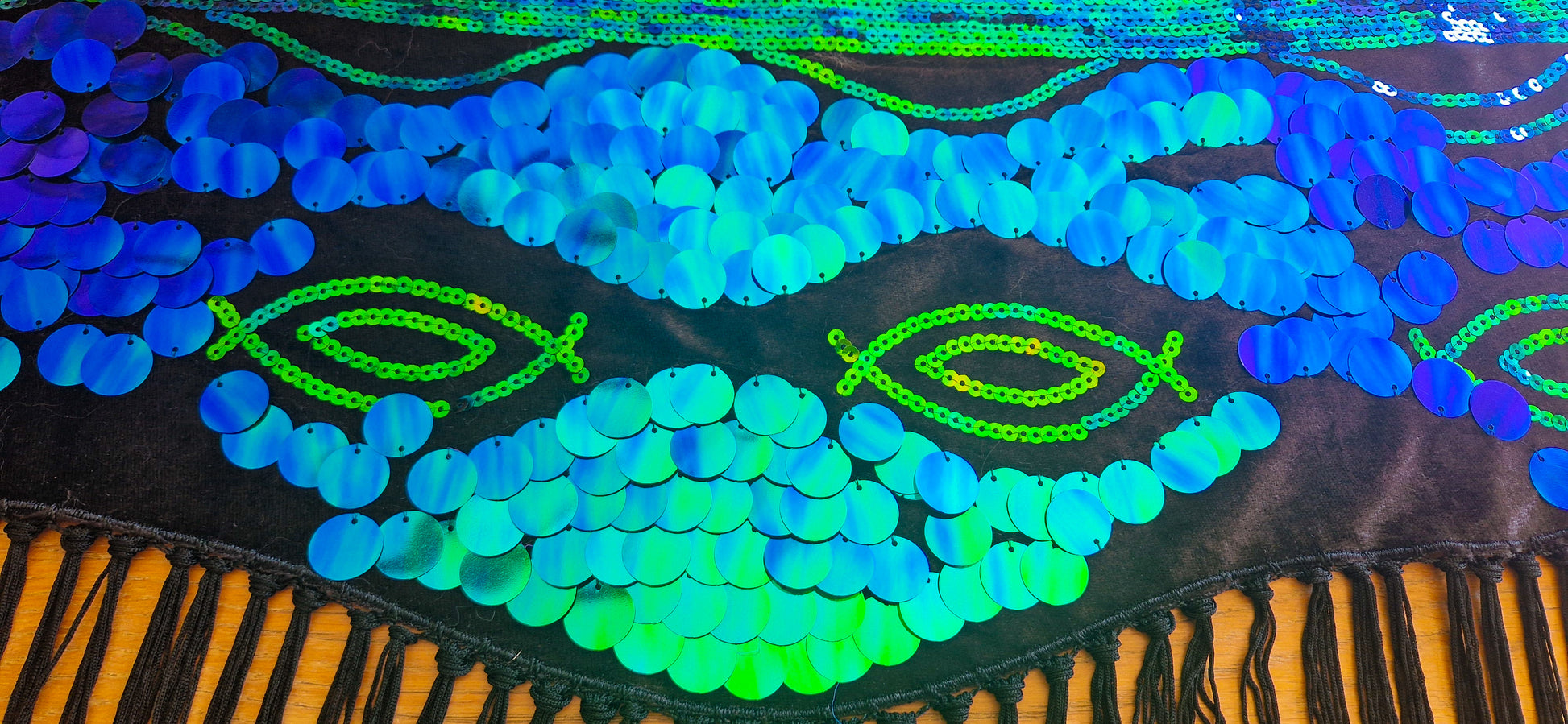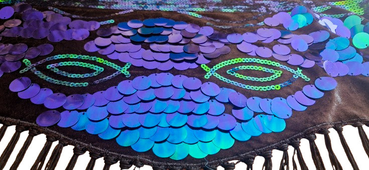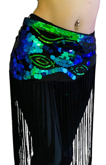 Deze prachtige heupsjaal in het zwart met paarse, groene en blauwe pailletten is een absolute eye-catcher! De pailletten veranderen van kleur door licht en beweging. De heupsjaal is gemaakt van zwarte fluwelen stof en heeft lange slierten die elegant meebewegen met elke beweging die je maakt.