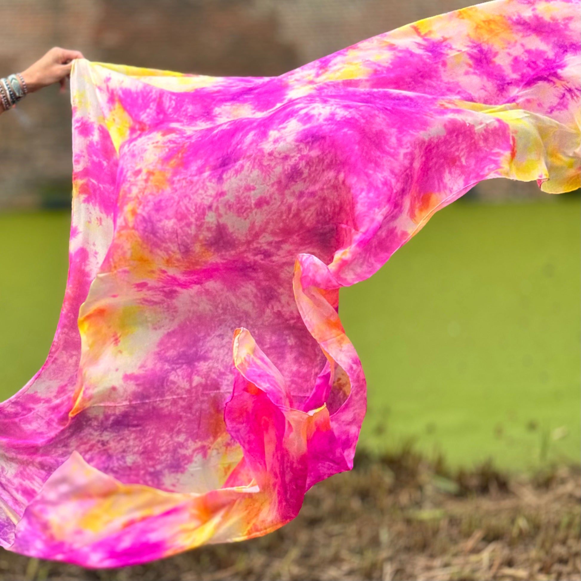 Zijde sluier in tie dye roze, oranje, geel en paars, de kleuren van de Peony bloem